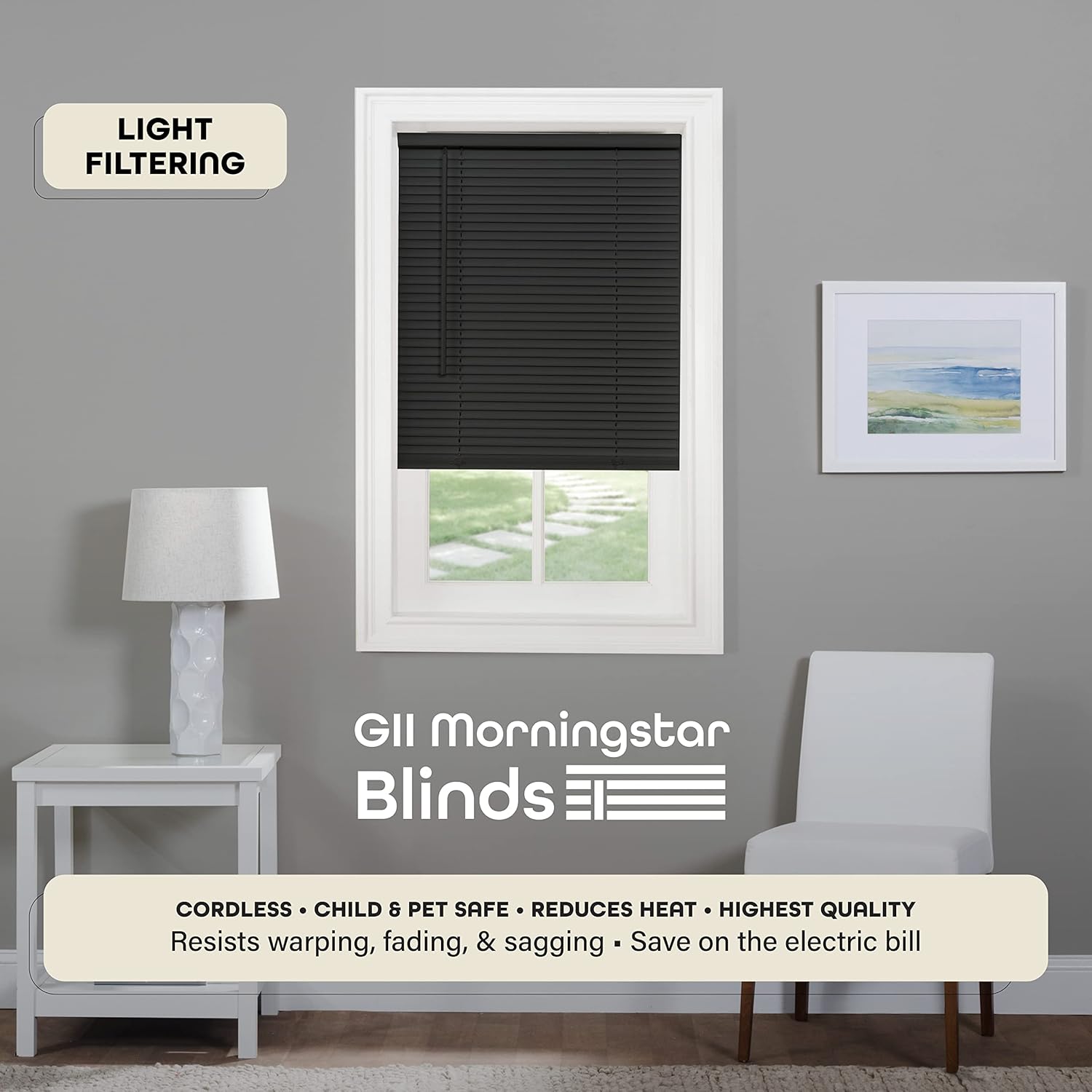 Elevate your home’s window treatments with the Cordless GII Morningstar Horizontal Mini Blind by Achim Home Decor. Designed for ease and style, this light-filtering blind blends functionality and safety in a sleek black finish. The cordless design ensures a clean look while removing hazards for children and pets, and the 1″ slats offer flexible light control and privacy.